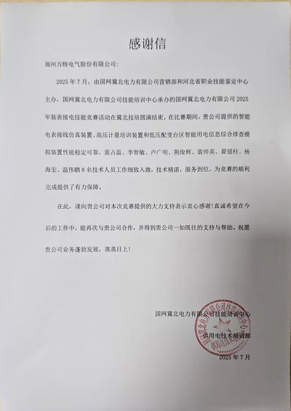 在剛剛結(jié)束的國(guó)網(wǎng)河南電力裝表接電及反竊電技能競(jìng)賽和國(guó)網(wǎng)冀北電力聯(lián)合河北省職業(yè)技能鑒定中心主辦的裝表接電賽事中,面對(duì)分布式能源安裝、線損分析等復(fù)雜場(chǎng)景,公司設(shè)備全程穩(wěn)定運(yùn)行,為大賽順利進(jìn)行提供了關(guān)鍵技術(shù)保障??蛻舴謩e在感謝信中強(qiáng)調(diào),我司派遣的技術(shù)人員“細(xì)致入微,技術(shù)精湛,服務(wù)到位”、“堅(jiān)守崗位,保障賽事零故障”。