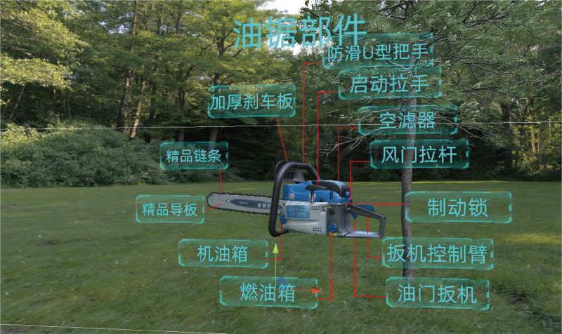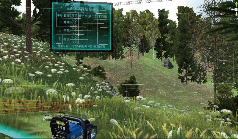 本項目在虛擬場景中搭建輸電線路環(huán)境,按照真實作業(yè)流程模擬樹障清理的整個過程,通過采用VR 互動技術(shù) 為參訓(xùn)人員提供沉浸式的作業(yè)訓(xùn)練環(huán)境;模擬開展真實的樹障清理工作,對實訓(xùn)人員的操作情況進行監(jiān)視、 記錄,通過畫面警示、聲音報警、文字提示、觸覺感知等形式,對操作行為給予實時的反饋與警示。