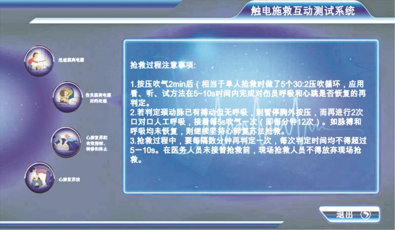 以情景再現(xiàn)方式模擬虛擬 場景下觸電事故現(xiàn)場,讓 學(xué)員選擇不同的物品進(jìn)行 施救,掌握發(fā)生觸電事故時使用正確的物品進(jìn)行施 救,掌握怎樣使傷者正確 脫離電源的步驟。掌握現(xiàn) 場心肺復(fù)蘇正確方法,系 統(tǒng)記錄學(xué)員施救過程并給 以評判結(jié)果。